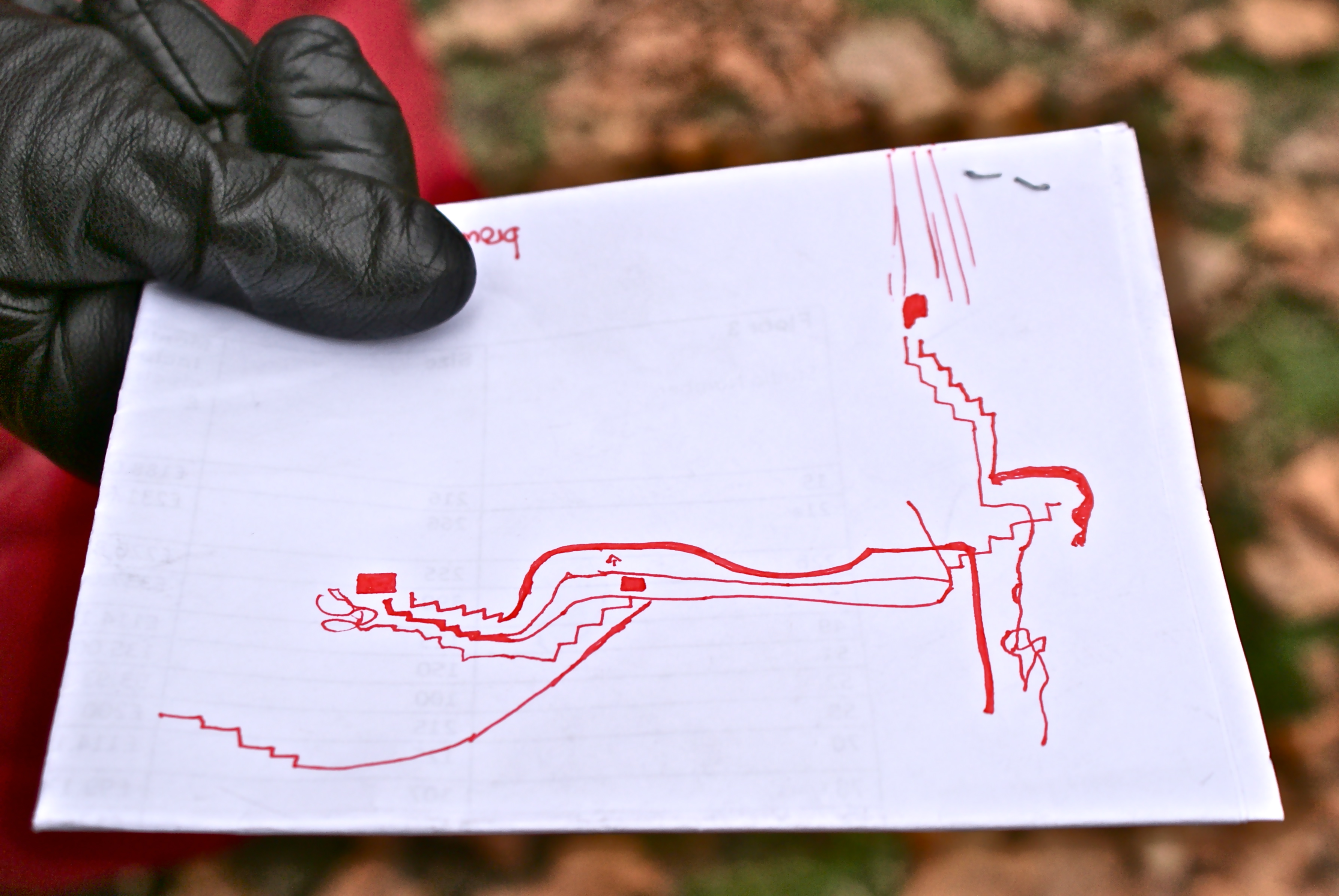 Meeting. Brief explanations. The scores as maps, the red wool as marker; sights and sites, passages and promenades.