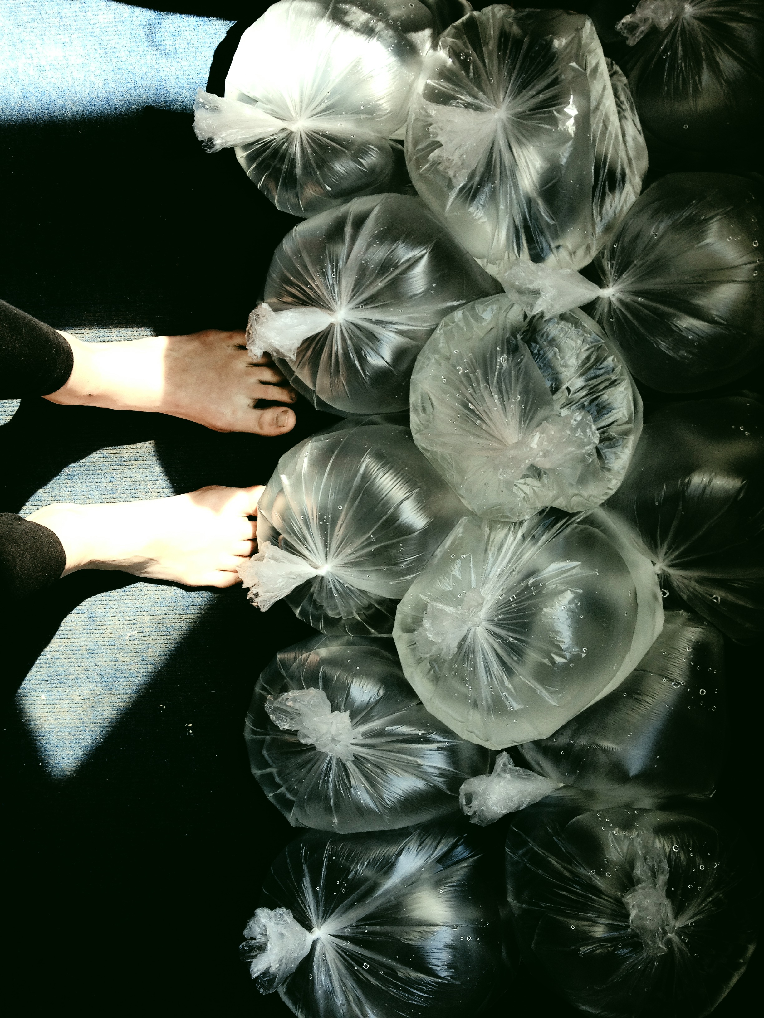 The bag. The Void. The weight. The light the heavy; the sense that we are truly such a container as this. There are bags all over the floor and somehow they are becoming identities.