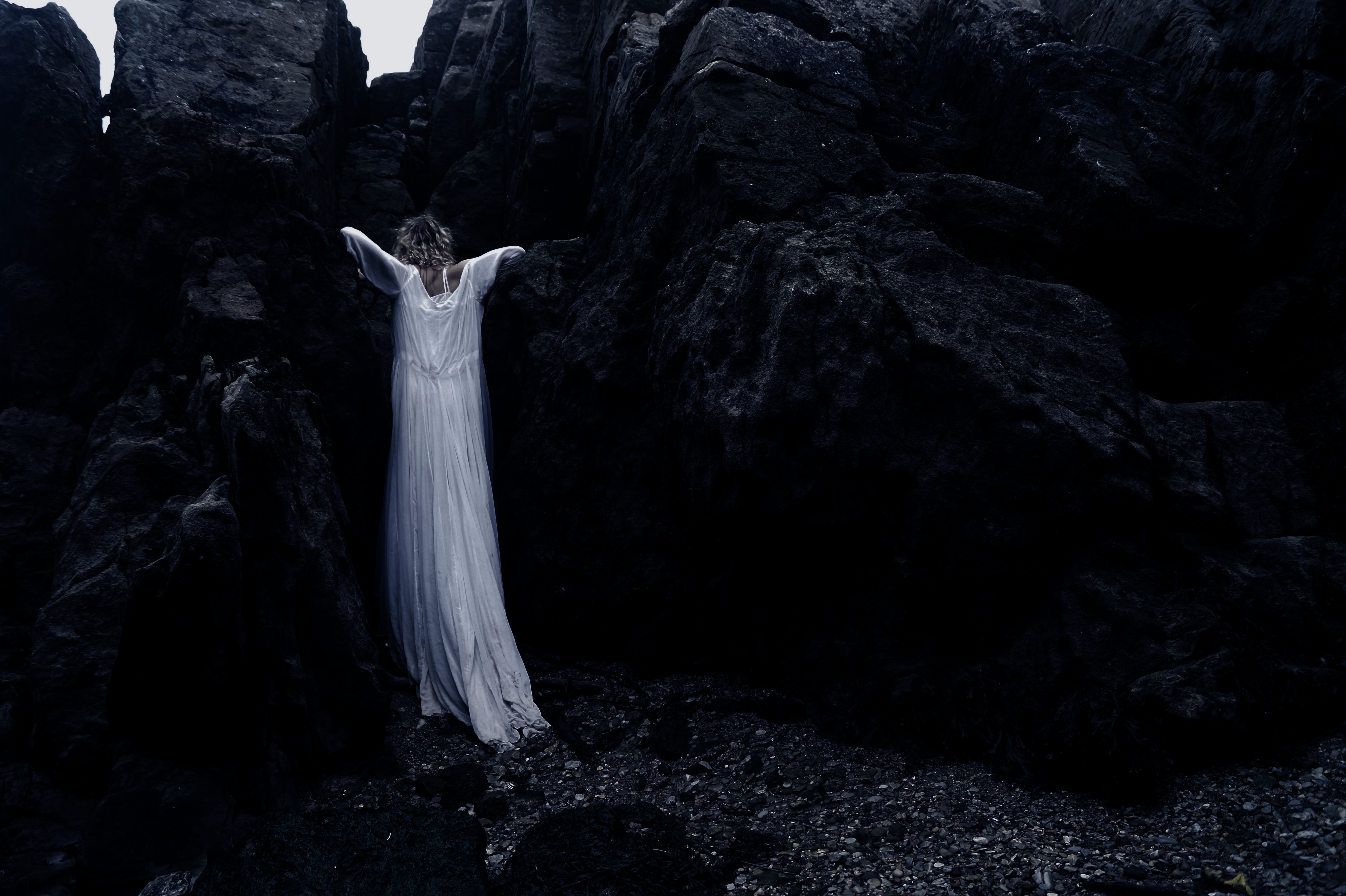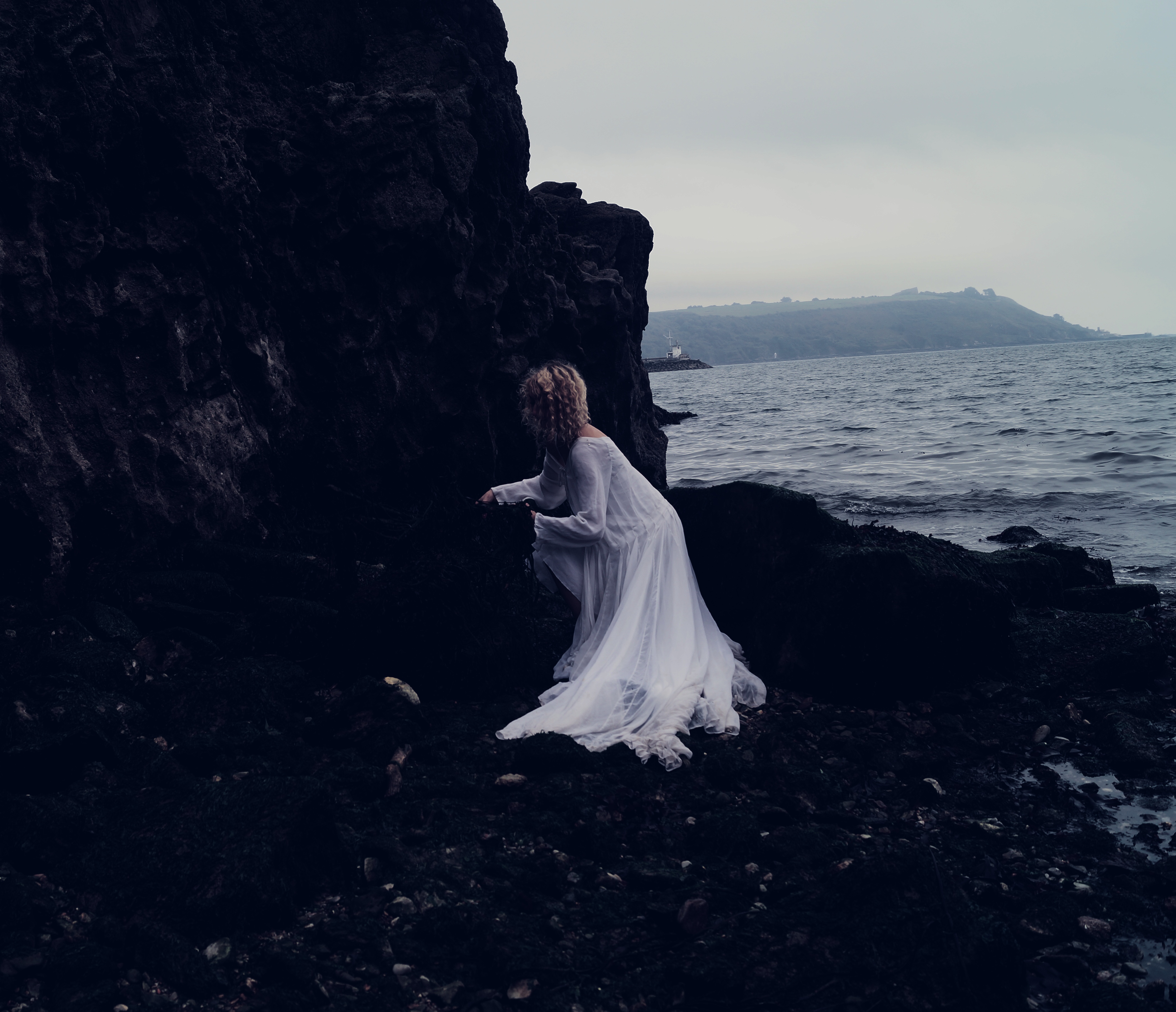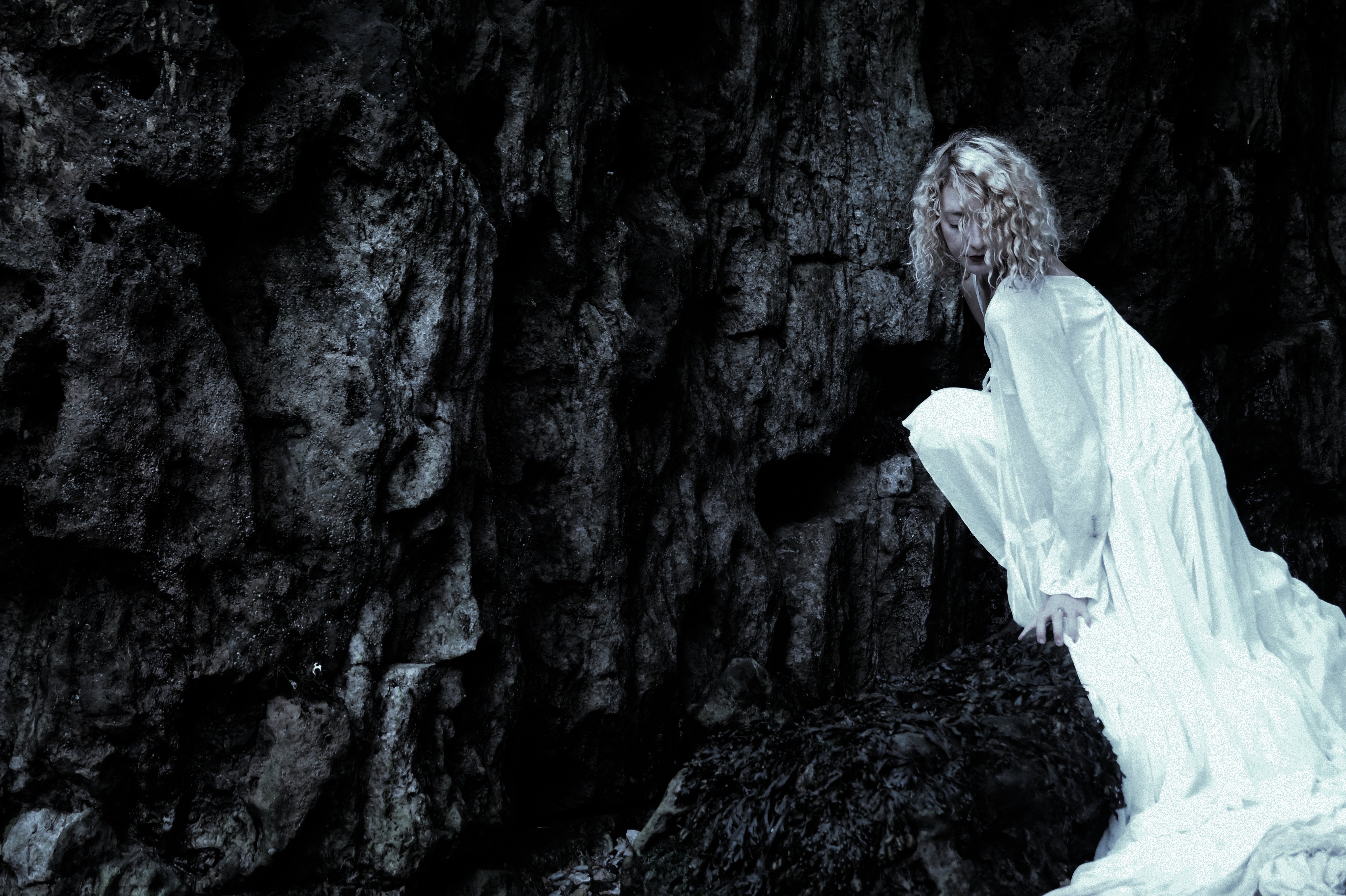 The seagull has watched the whole thing, the lady is wet now, sodden and cold and the tree floats on the waves. Maybe she cries a little. The sea gull cannot tell as the rain comes now. The lady or girl, or human retreats back into the caves and tries to become a fish so that she can join the tree.